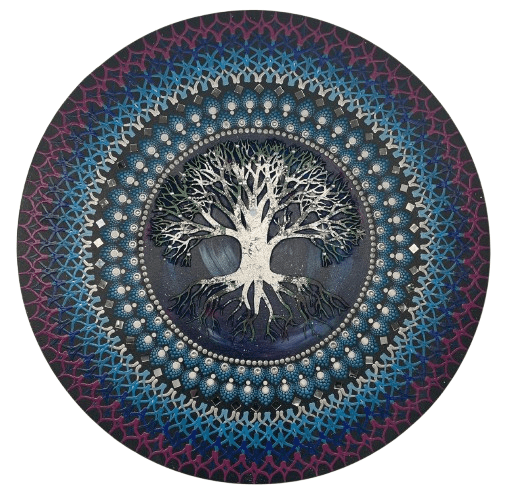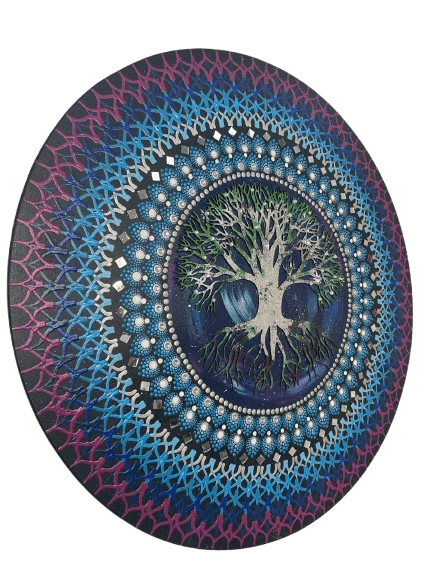 Essa mandala além de uma linda obra de arte pintada à mão, tem como finalidade harmonizar o ambiente e as pessoas que nele convivem ou frequentam, com vibração e frequência de Equilibrio, harmonia e Transmutação, no centro de fundo uma pintura do universo, representando o conjunto de toda a matéria, energia, tempo e espaço, simbolizando a totalidade da existência, a conexão do todo. Na self aplicado a árvore da vida trabalhada com folhas de prata, a árvore da vida é um símbolo que atravessa gerações, desde culturas ocidentais, como celtas, gregos, romanos, persas, até culturas orientais, como a chinesa e a japonesa, a árvore da vida representa vitalidade, força e capacidade de vencer desafios, representa também nosso desenvolvimento pessoal, singularidade e beleza individual. Assim como os galhos de uma árvore se fortalecem e crescem em direção ao céu, nós também ficamos mais fortes, lutando por maior conhecimento, sabedoria e novas experiências à medida que avançamos pela vida. Ela também pode representar nossos ancestrais simbolizado pelas suas raízes, e os galhos seriam nossa família hoje, honrando e agradecendo nossos ancestrais teremos galhos fortes com frutos. Na cromoterapia o lilás, cor que acalma a mente, transmuta pensamentos negativos e equilibra o chakra coronário, promovendo espiritualidade e serenidade, auxilia na meditação aumentando a intuição e transmutação de energias pessimistas em positivas. É calmante e relaxante, ajudando a diminuir o estresse e a ansiedade, além de estimular a criatividade. O azul também promove calma, relaxamento e equilíbrio, uma cor calmante, reduz ansiedade, estresse, insônia, além de induzir o sono restaurador  Chakras: Muladhara, o 1º chakra, Visudha, o 5º Chakra, Ajna, o 6º chakra e Sahasrara, o 7º chakra.