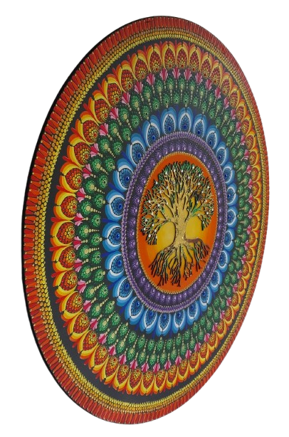 Essa mandala além de uma linda obra de arte pintada à mão na técnica de pontilhismo, tem como finalidade harmonizar o ambiente e as pessoas que nele convivem ou frequentam, com vibração e frequência de Equilíbrio, força e prosperidade, utiliza na cromoterapia as cores dos 7 chakras principais. A palavra Chakra vem do sânscrito e significa roda, disco, centro ou plexo. Os chakras são vórtices (redemoinhos) de energia vital, espirais girando em alta velocidade, vibrando em pontos vitais de nosso corpo. Cada chakra possui significado, cor, mantra e elemento específicos, que estimulam seu movimento. Estão associados às glândulas e funcionam como centros de captação e distribuição de energia.