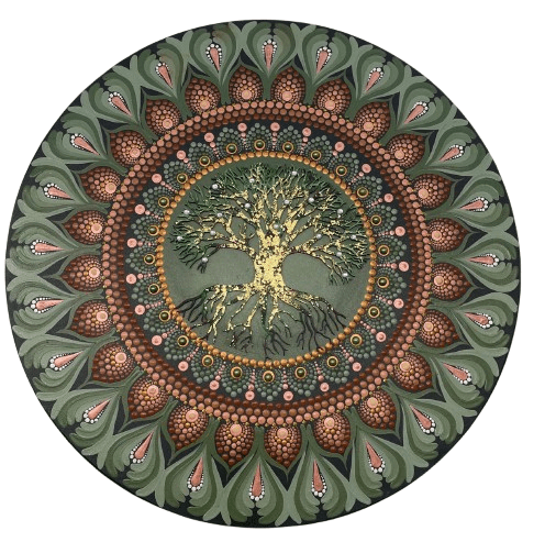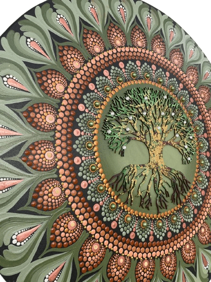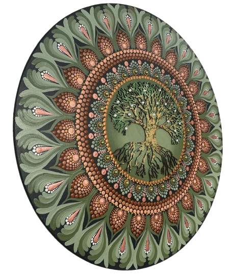 Essa mandala além de uma linda obra de arte pintada à mão, tem como finalidade harmonizar o ambiente e as pessoas que nele convivem ou frequentam, com vibração e frequência de Prosperidade, força e confiança, na cromoterapia o verde na frequência de cura e saúde, o dourado remetendo ao ouro como metal precioso emanando prosperidade como um todo, não somente material, o marron associado à natureza, ao conforto e à simplicidade, também é a cor que nos liga ao que vem da terra, trazendo força, estabilidade e confiança. Possui em sua self a árvore da vida cortada a laser em mdf, trabalhada com folhas de ouro. A árvore da vida é um símbolo que atravessa gerações, desde culturas ocidentais, como celtas, gregos, romanos, persas, até culturas orientais, como a chinesa e a japonesa, a árvore da vida representa vitalidade, força e capacidade de vencer desafios, representa também nosso desenvolvimento pessoal, singularidade e beleza individual. Assim como os galhos de uma árvore se fortalecem e crescem em direção ao céu, nós também ficamos mais fortes, lutando por maior conhecimento, sabedoria e novas experiências à medida que avançamos pela vida. Ela também pode representar nossos ancestrais simbolizado pelas suas raízes, e os galhos seriam nossa família hoje, honrando e agradecendo nossos ancestrais teremos galhos fortes com frutos, além disso de fundo uma pintura de sol trazendo luz e vida para essa mandala. Chakras: Muladhara, o 1º chakra, Visudha, o 5º Chakra, Ajna, o 6º chakra e Sahasrara, o 7º chakra.