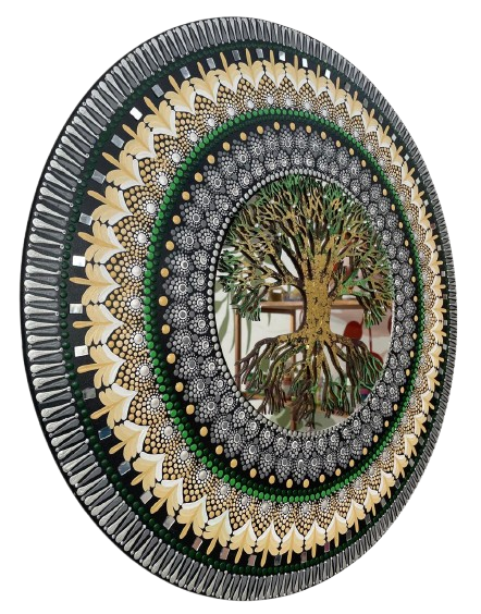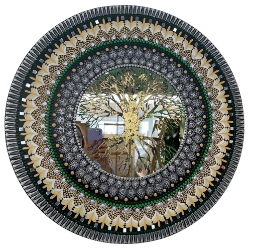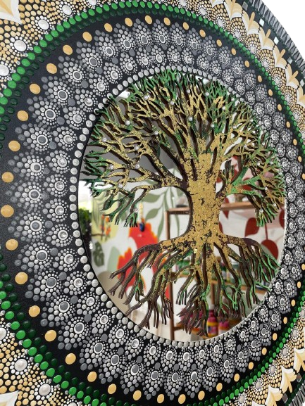 Essa mandala além de uma linda obra de arte pintada à mão, tem como finalidade harmonizar o ambiente e as pessoas que nele convivem ou frequentam, com vibração e frequência de Suavidade, força e conforto, em sua self temos um espelho redondo de 30cm, o espelho é um repelente de energias, sejam boas ou ruins é repelida do ambiente, aplicado sob o espelho a árvore da vida cortada a laser em mdf, trabalhada com folhas de ouro. A árvore da vida é um símbolo que atravessa gerações, desde culturas ocidentais, como celtas, gregos, romanos, persas, até culturas orientais, como a chinesa e a japonesa, a árvore da vida representa vitalidade, força e capacidade de vencer desafios, representa também nosso desenvolvimento pessoal, singularidade e beleza individual. Assim como os galhos de uma árvore se fortalecem e crescem em direção ao céu, nós também ficamos mais fortes, lutando por maior conhecimento, sabedoria e novas experiências à medida que avançamos pela vida. Ela também pode representar nossos ancestrais simbolizado pelas suas raízes, e os galhos seriam nossa família hoje, honrando e agradecendo nossos ancestrais teremos galhos fortes com frutos. Na cromoterapia a cor Bege que transmite calma e passividade, trazendo na decoração um toque de sofisticação e aconchego, por ser de cor neutra, transmite calma, serenidade, é um tom que convida à conversa por causa do efeito relaxante que ela exerce. Seu significado está associado ao luxo. Temos também o cinza, a mistura do claro e escuro, do preto e do branco, é o símbolo do equilíbrio e das soluções de conflito, bem combinado pode ser moderno, harmonioso, chique e marcante, é muito utilizada como simbolismo do equilíbrio e autocontrole. Em ambientes, é uma cor neutra, a qual traz elegância, estilo e destaque a objetos e móveis com cores mais fortes. O verde com leve detalhe, harmonizando com a àrvore ao centro, a cor que remete ao equilíbrio, cura, renovação e harmonia. É uma cor que promove a calma e o bem-estar, ajudando a reduzir o estresse e a ansiedade, está ligado à natureza e ao crescimento, simbolizando esperança e satisfação. Chakras: Muladhara, o 1º chakra, Manipura, o 3º chakra, Anahata, o 4º chakra e Visudha, o5º Chakra.