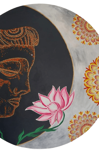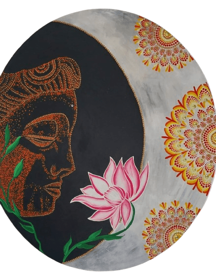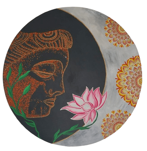 Essa mandala além de uma linda obra de arte pintada à mão na técnica de pontilhismo tem como finalidade harmonizar o ambiente e as pessoas que nele convivem ou frequentam com vibração e frequência de Expansão da consciência e emoções positivas, possui uma linda pintura de pontilhismo do contorno da face de Buda, protuberante representa a desconexão entre a mente e o corpo – o estado Bodhisattva. Os olhos semifechados mostram um estado de meditação – olhar para dentro e para fora. O leve sorriso retrata a serena natureza e nobreza do Buda após atingir a iluminação. – significa a flor de lótus, aquela que nasce do lodo e floresce. Ela nasce da escuridão, de onde há sujeira e dificuldade, abre suas flores somente após ter subido além da superfície do lodo. Cria emoções positivas e muito forte para quem tem dificuldades de lidar com suas próprias emoções, conectando isso temos essa linda flor pintada nessa mandala a frente de Buda. Essa mandala é maravilhosa, possui também a pintura da lua no ciclo crescente com mandalas pontilhismo no seu interior, nas cores amarelo e laranja trazendo energia de alegria. No seu movimento de rotação ao redor da Terra, a Lua reflete a luz solar de diversos ângulos. A lunação é o ciclo que começa a cada Lua Nova, quando Sol e Lua se encontram no mesmo grau de um signo. É quando a Lua se posiciona entre o Sol e a Terra e por isso não reflete luz. Nesse momento, é liberada uma energia de manifestação para trabalharmos aqui na Terra. Não se esqueça de que tudo é energia, certo? E os signos onde os astros se encontram são a qualidade das energias que trocamos com o universo.