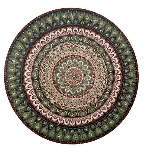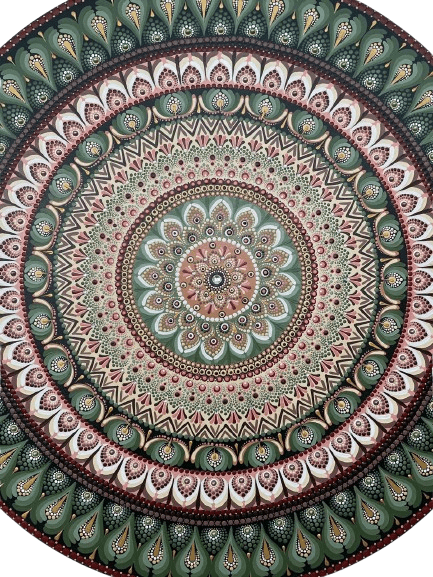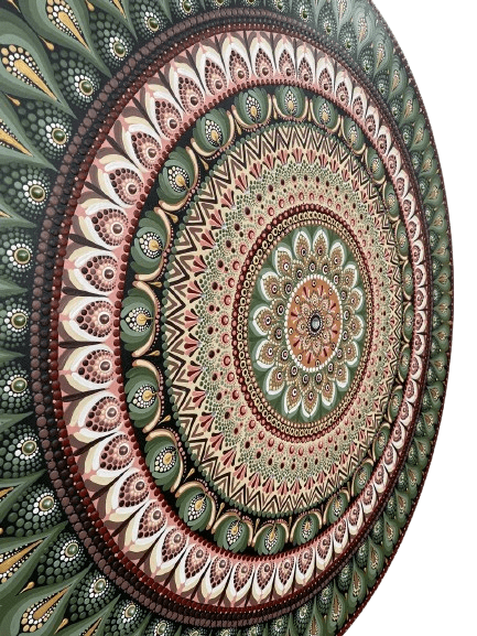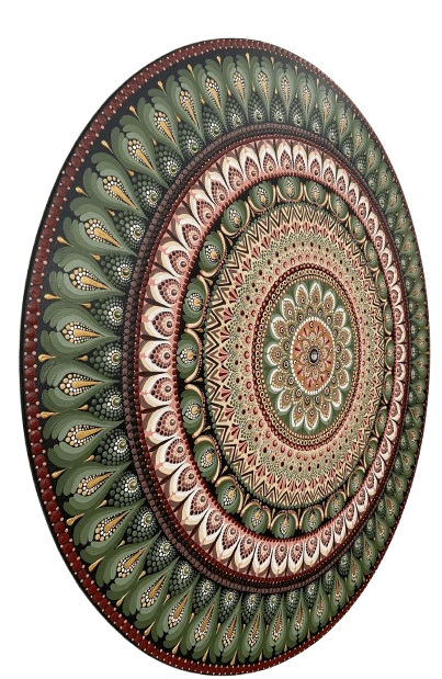 Essa mandala além de uma linda obra de arte pintada à mão, tem como finalidade harmonizar o ambiente e as pessoas que nele convivem ou frequentam com vibração e frequência de Calma, saúde e amor, utiliza na cromoterapia a cor verde simboliza equilíbrio, cura, saúde e renovação, atuando como um tom calmante e relaxante para o corpo e a mente. Associada ao chakra cardíaco, ajuda no equilíbrio emocional, redução do estresse e pode auxiliar no tratamento do sistema digestivo e cicatrização. É uma das cores mais abundantes no planeta, e contribui para aliviar a tensão, trazendo sensação de equilíbrio interno, calma e harmonia. O verde possui efeito calmante, refrescante e suavizante em todo o organismo, agindo como regenerador e harmonizador dos órgãos e sistemas. A cor verde tem a propriedade de ativar a normalização das funções endócrinas, estimulando a glândula pituitária, que é a responsável pelo bom funcionamento das demais glândulas. A cor rosa simboliza amor incondicional, afeto, ternura e harmonia nos relacionamentos. Associada ao chakra cardíaco, ajuda no equilíbrio emocional, cura de mágoas, perdão e comunicação amorosa. É usada para suavizar o ambiente, tonificar o sistema nervoso e purificar o sangue. Pode auxiliar no tratamento de depressão, possibilitando o aumento de algumas substâncias capazes de melhorar o humor, como a famosa serotonina. Chakras: Anahata, o 4º chakra