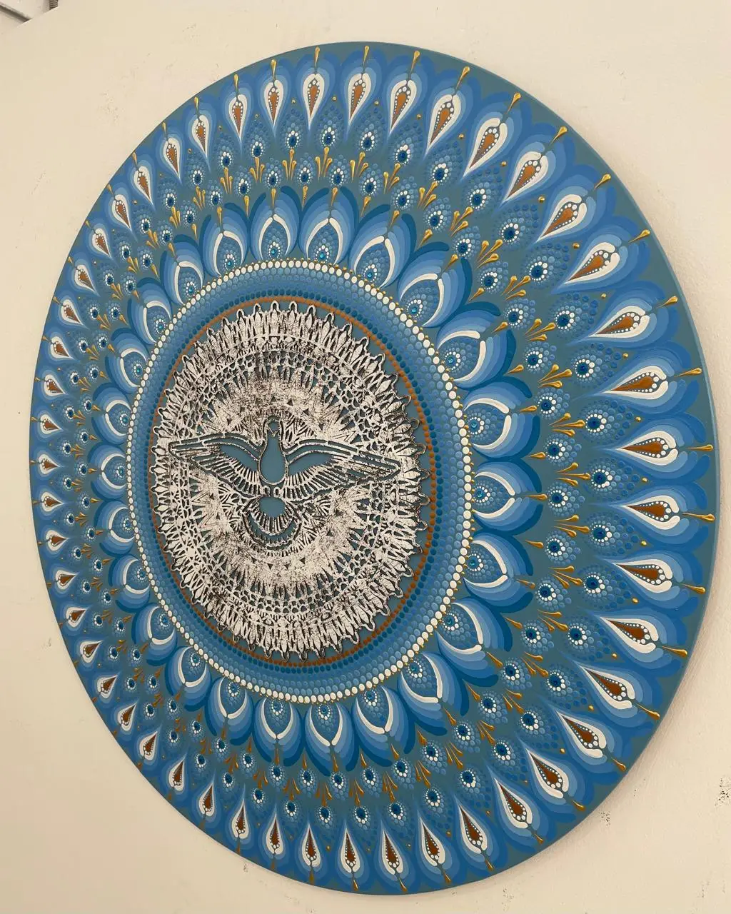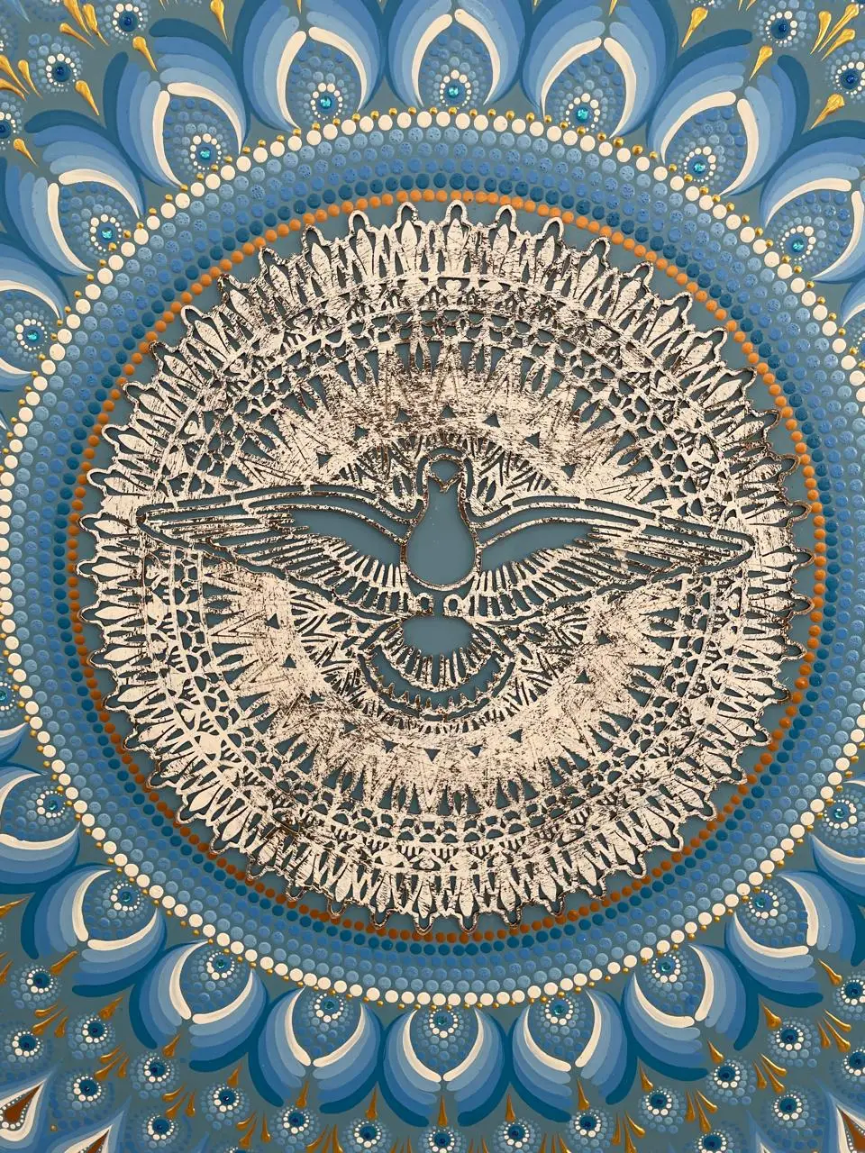 Essa mandala além de uma linda obra de arte pintada à mão, tem como finalidade harmonizar o ambiente e as pessoas que nele convivem ou frequentam com vibração e frequência de Proteção do Divino Espírito Santo, utiliza na cromoterapia as cores branco, associada a pureza e aos bons fluidos, simboliza a paz, o azul, é utilizada para tratar problemas de sono, insônia e estresse, pois é considerada uma cor calmante e tranquilizante. O azul tem propriedades terapêuticas que podem ajudar a melhorar a tensão da mente e do corpo, reduzir a frequência cardíaca, o ritmo respiratório e a pressão sanguínea. O dourado que está associado àprosperidade em todas as áreas da vida, derivado do amarelo-ouro, o dourado é um tom intenso que traz energia, vibração positiva e disposição, é a cor da sabedoria e é indicativo de alta espiritualidade.Possui no centro uma linda imagem do Divino com uma pintura de patina. Chakras: Visudha, o 5º chakra e Sahasrara, o 7º chakra.