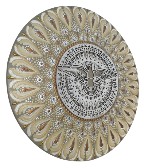 Essa mandala além de uma linda obra de arte pintada à mão, tem como finalidade harmonizar o ambiente e as pessoas que nele convivem ou frequentam com vibração e frequência de Proteção do Divino Espírito Santo, utiliza na cromoterapia as cores branco, associada a pureza e aos bons fluidos, simboliza a paz, o dourado que está associado àprosperidade em todas as áreas da vida, derivado do amarelo-ouro, o dourado é um tom intenso que traz energia, vibração positiva e disposição,  é a cor da sabedoria e é indicativo de alta espiritualidade. O bege que é clássico, neutro e suave, no entanto mais quente que o branco, traz aconchego para o ambiente, está relacionado à calma e à formalidade, cria uma sensação de espaço e limpeza sem fazer com que o ambiente pareça desagradável ​​e clínico. Possui no centro uma linda imagem do Divino com uma pintura de patina. Chakras: Visudha, o 5º chakra e Sahasrara, o 7º chakra.