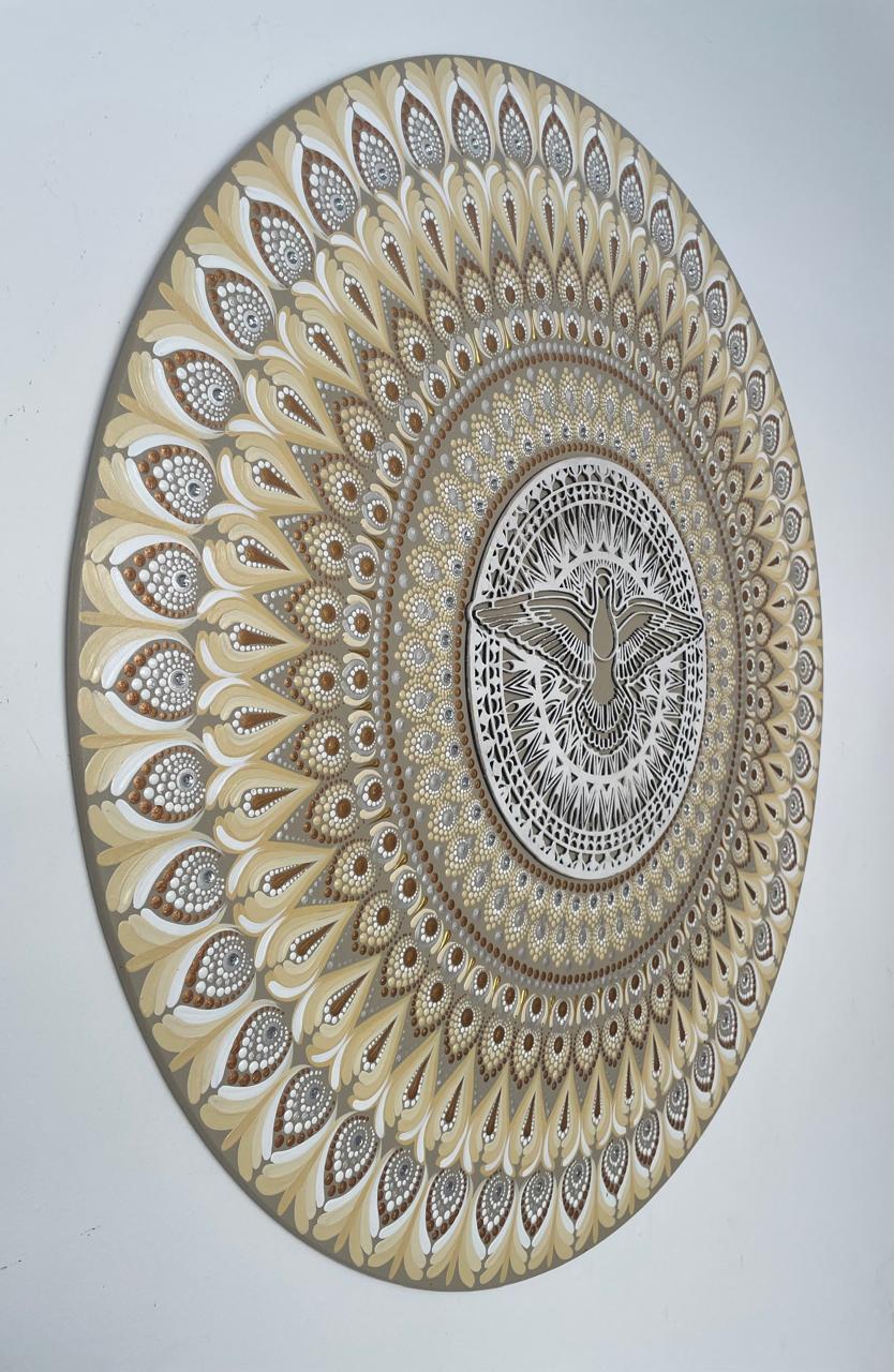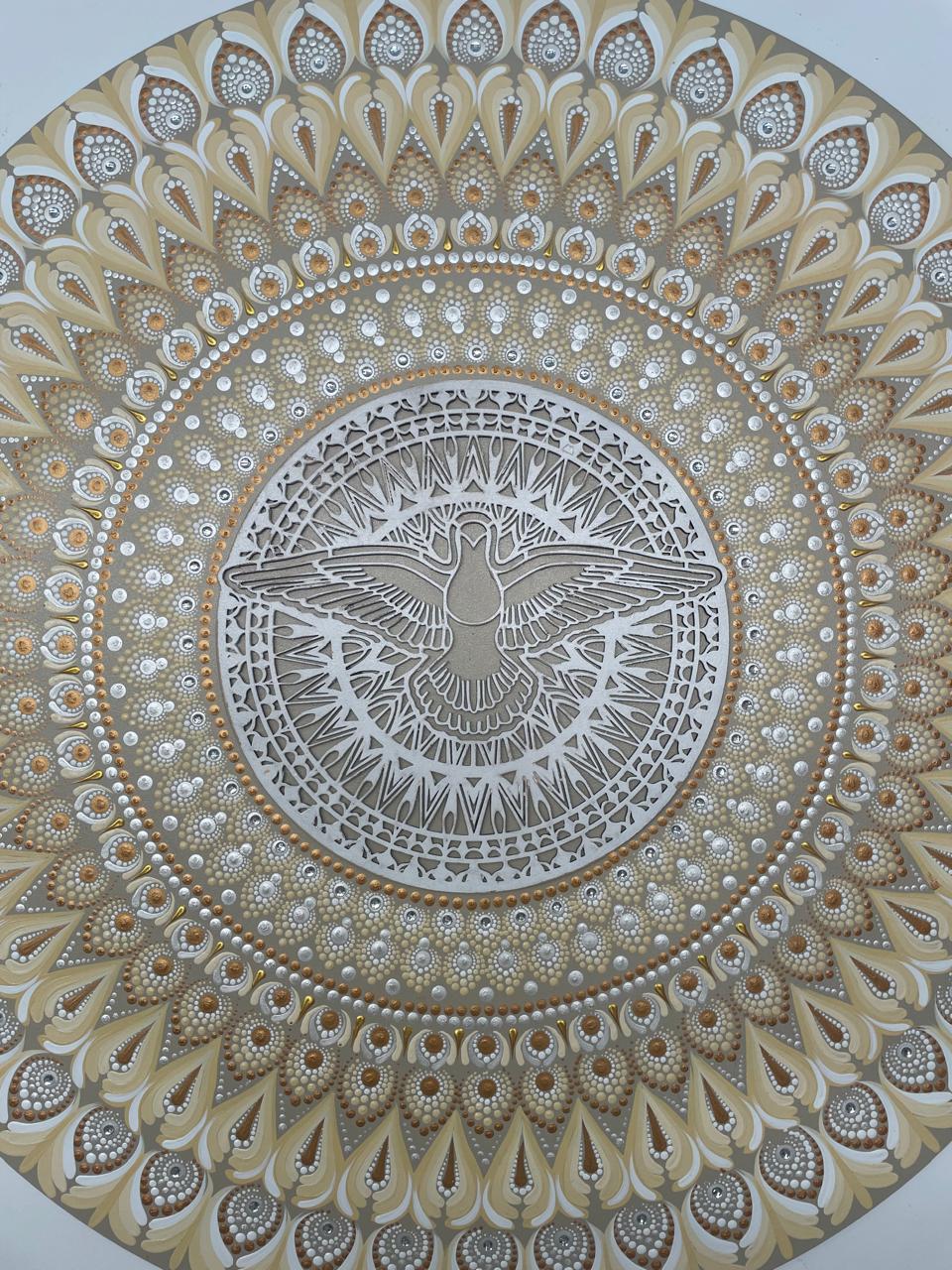 Essa mandala além de uma linda obra de arte pintada à mão, tem como finalidade harmonizar o ambiente e as pessoas que nele convivem ou frequentam com vibração e frequência de Proteção do Divino Espírito Santo, utiliza na cromoterapia as cores branco, associada a pureza e aos bons fluidos, simboliza a paz, o dourado que está associado àprosperidade em todas as áreas da vida, derivado do amarelo-ouro, o dourado é um tom intenso que traz energia, vibração positiva e disposição, é a cor da sabedoria e é indicativo de alta espiritualidade. O bege que é clássico, neutro e suave, no entanto mais quente que o branco, traz aconchego para o ambiente, está relacionado à calma e à formalidade, cria uma sensação de espaço e limpeza sem fazer com que o ambiente pareça desagradável e clínico. Possui no centro uma linda imagem do Divino com uma pintura de patina. Chakras: Visudha, o 5º chakra e Sahasrara, o 7º chakra.