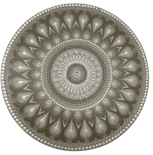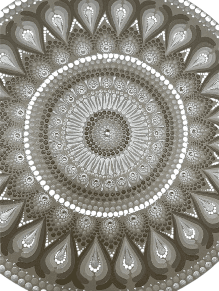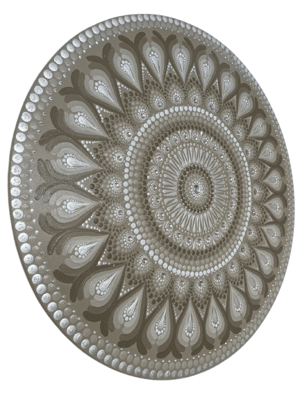 Essa mandala além de uma linda obra de arte pintada à mão, tem como finalidade harmonizar o ambiente e as pessoas que nele convivem ou frequentam, com vibração e frequência de Mandala Elegência, Aconchego e Proteção, na cromoterapia a cor Bege, que transmite calma e passividade, trazendo na decoração um toque de sofisticação e aconchego, por ser de cor neutra, transmite calma, serenidade, é um tom que convida à conversa por causa do efeito relaxante que ela exerce. Seu significado está associado ao luxo. O prata, que está associada à energia lunar, intuição, sabedoria emocional e proteção espiritual, agindo como um agente de renovação interna e equilíbrio. Considerada um escudo contra energias densas, ajuda na limpeza energética. Ela é utilizada para desintegrar energias negativas (“trabalhos” ou aparelhos parasitas), corrigir polaridades conscientes e estimular a circulação sanguínea. A cor branca simboliza pureza, paz, harmonia e a união de todas as frequências de cor, atuando como um equilibrador energético geral do corpo e mente. Limpa energias negativas, promove clareza mental, concentração e tranquilidade, sendo ideal para ambientes de reflexão e meditação. Chakras: Muladhara o 1º chakra , Ajna o 6º Chackra e Sahasrara o 7º Chackra.