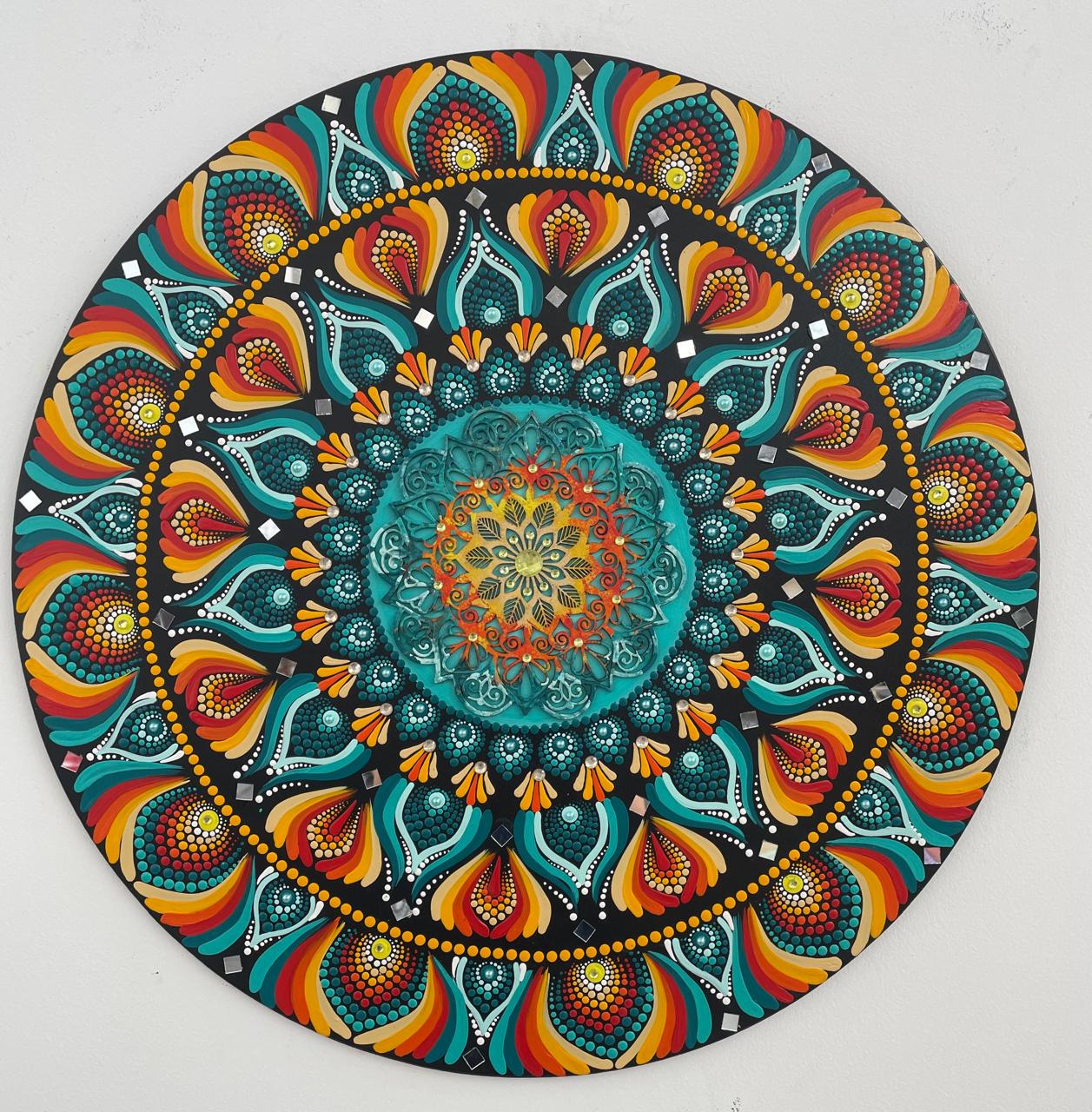 Essa mandala além de uma linda obra de arte pintada à mão na técnica de pontilhismo, tem como finalidade harmonizar o ambiente e as pessoas que nele convivem ou frequentam, com vibração e frequência de Equilíbrio, alegria e regeneração, possui em sua self uma linda geometria de mdf cortado a laser. Na cromoterapia o azul na tonalidade de turqueza trazendo calma e equilíbrio, o laranja emanando alegria, seu poder energético aumenta a autoestima, dá disposição e incentiva o intelecto, por ser uma mistura do vermelho com o amarelo, é também uma cor quente e estimulante, muito utilizada para tratamento de depressão, o amarelo que estimula criatividade, e por fim o vermelho para restabelecer a vitalidade, melhorar o funcionamento do coração e ativar a circulação sanguínea. O Chakras: Muladhara, o 1º chakra, Visudha, o 5º Chakra, Ajna, o 6º chakra e Sahasrara, o 7º chakra.
