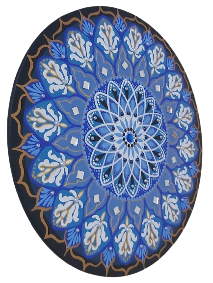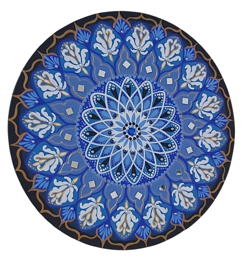 Essa mandala além de uma linda obra de arte pintada à mão, tem como finalidade harmonizar o ambiente e as pessoas que nele convivem ou frequentam, com vibração e frequência de Equilíbrio, conforto e organização, utiliza na cromoterapia as cores azul que remete a paciência, harmonia e equilíbrio, no plano material é atrativa, traz amizades e recursos materiais, o bege, remete ao clássico, ao calmo e passivo, transmite sensatez, conforto, organização, estabilidade, confiança, simplicidade, tranquilidade e leveza. Possui uma base numérica 3, que tem como palavra chave expansão, estimula comunicabilidade, atenção e determinação, ao redor de sua self uma linda geometria de movimento circular de energia. Chakras: Manipura o 3º chakra e Visudha o 5° chakra.
