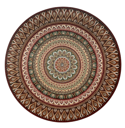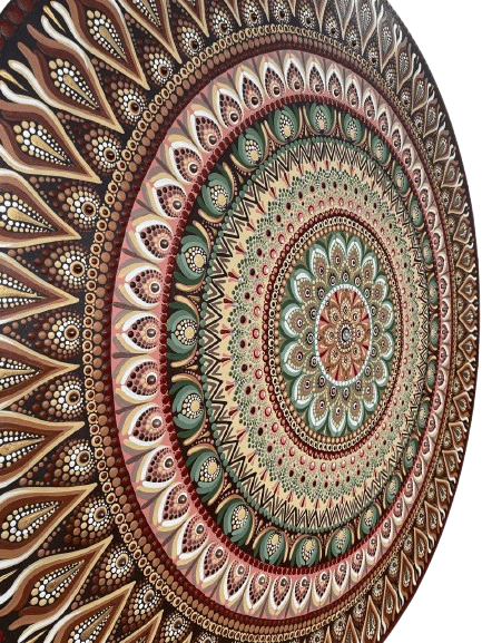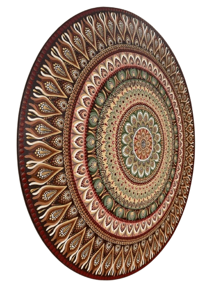 Essa mandala além de uma linda obra de arte pintada à mão, tem como finalidade harmonizar o ambiente e as pessoas que nele convivem ou frequentam com vibração e frequência de Calma, saúde e amor, utiliza na cromoterapia o marrom, representa estabilidade, segurança, conexão com a terra e aterramento, proporcionando calma e solidez em momentos de instabilidade. É uma cor que promove aconchego e estrutura, sendo ideal para criar ambientes de confiança. A cor verde simboliza equilíbrio, cura, saúde e renovação, atuando como um tom calmante e relaxante para o corpo e a mente. Associada ao chakra cardíaco, ajuda no equilíbrio emocional, redução do estresse e pode auxiliar no tratamento do sistema digestivo e cicatrização. É uma das cores mais abundantes no planeta, e contribui para aliviar a tensão, trazendo sensação de equilíbrio interno, calma e harmonia. O verde possui efeito calmante, refrescante e suavizante em todo o organismo, agindo como regenerador e harmonizador dos órgãos e sistemas. A cor verde tem a propriedade de ativar a normalização das funções endócrinas, estimulando a glândula pituitária, que é a responsável pelo bom funcionamento das demais glândulas. A cor rosa simboliza amor incondicional, afeto, ternura e harmonia nos relacionamentos. Associada ao chakra cardíaco, ajuda no equilíbrio emocional, cura de mágoas, perdão e comunicação amorosa. É usada para suavizar o ambiente, tonificar o sistema nervoso e purificar o sangue. Pode auxiliar no tratamento de depressão, possibilitando o aumento de algumas substâncias capazes de melhorar o humor, como a famosa serotonina. Chakras: Anahata, o 4º chakra
