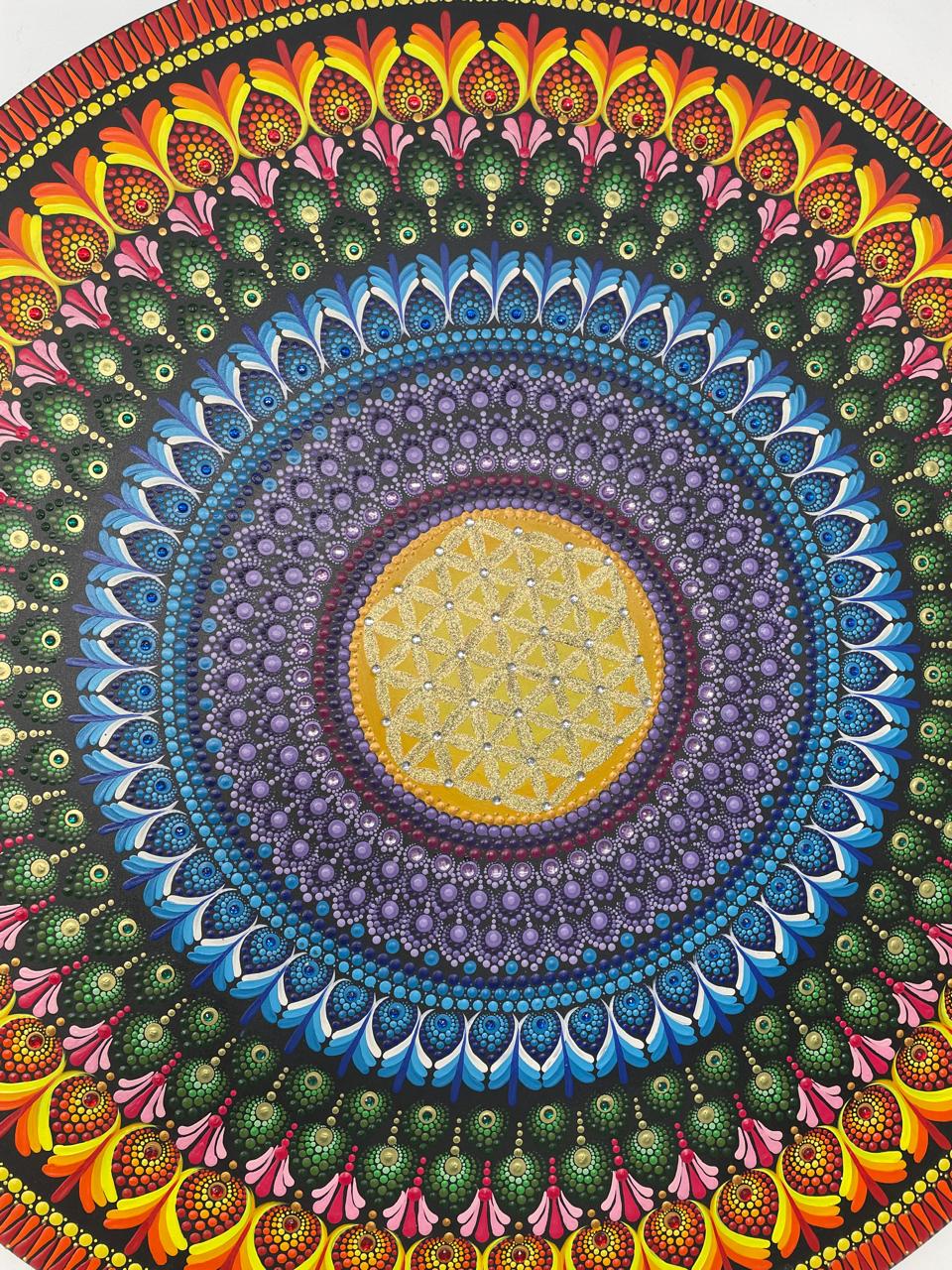 Essa mandala além de uma linda obra de arte pintada à mão na técnica de pontilhismo, tem como finalidade harmonizar o ambiente e as pessoas que nele convivem ou frequentam, com vibração e frequência de Equilíbrio, harmonia e conexão, utiliza na cromoterapia as cores dos 7 chakras principais. A palavra Chakra vem do sânscrito e significa roda, disco, centro ou plexo. Os chakras são vórtices (redemoinhos) de energia vital, espirais girando em alta velocidade, vibrando em pontos vitais de nosso corpo. Cada chakra possui significado, cor, mantra e elemento específicos, que estimulam seu movimento. Estão associados às glândulas e funcionam como centros de captação e distribuição de energia.