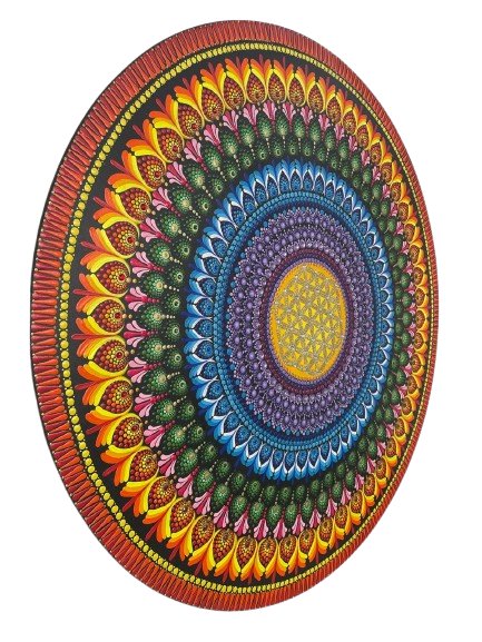 Possui no centro a florda vida, a geometria sagrada, ela representa a conexão entre todas as formas de vida e a consciência coletiva. Em outras palavras, é a representação do Todo. Mas, além disso, a Flor da Vida é um símbolo de harmonia, equilíbrio e alegria. Acredita-se que contemplá-la ou meditar sobre ela pode trazer cura, paz e conexão mais profunda com o universo.Chakras: Muladhara, o 1º chakra, Suadisthana o 2° Chakra, Manipura o 3º Chakra, Anahata o 4º Chakra, Vishuda, o 5º Chakra, Ajna, o 6º chakra e Sahasrara, o 7º chakra.