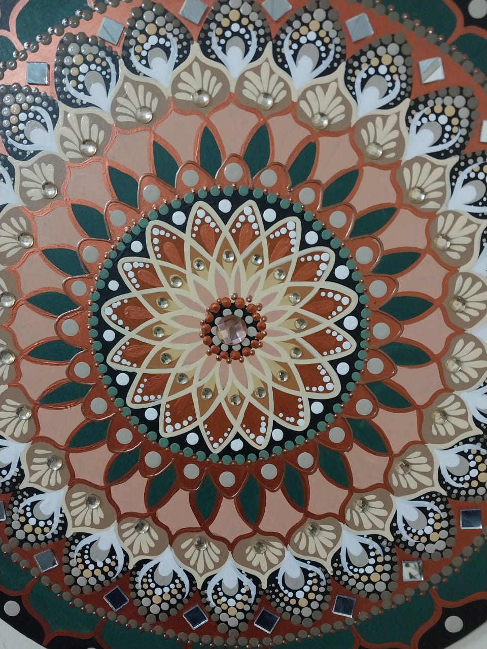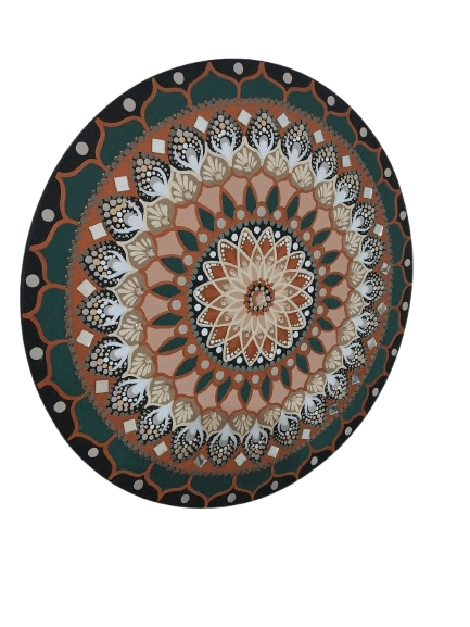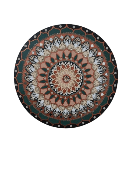 Essa mandala além de uma linda obra de arte pintada à mão, tem como finalidade harmonizar o ambiente e as pessoas que nele convivem ou frequentam, com vibração e frequência de fortuna e prosperidade, utiliza na cromoterapia as cores bronze, é considerado muito bom para aumentar a capacidade de se expressar e aceitar sentimentos verdadeiros e equilibrar as qualidades pessoais e a auto afirmação, por ser um metal com preciosidade também remete a prosperidade, a cor verde, associado à cura, equilíbrio, renovação e saúde. Acalma, reduz o estresse, a ansiedade e a irritação, além de estar ligado à natureza, crescimento e harmonia interna. Seus benefícios incluem a harmonização do corpo e mente, a estimulação do sistema imunológico. O preto para isolar e repelir, afasta o medo, traumas e insônia, representa poder, elegância e proteção, atrai mistério, autoridade e bloqueaia energias negativas, sendo ideal para detalhes ou ambientes com pé-direito alto, pois ajuda a dar mais intensidade a outras cores. No Feng Shui, o preto é a cor do elemento Água, associada à sabedoria, espiritualidade, mistério e profundidade, deve ser equilibrado com cores claras ou vibrantes, especialmente em ambientes como a cozinha, que representa a prosperidade financeira. Chakras: Muladhara, o 1º chakra e Anahata, o 4º chakra