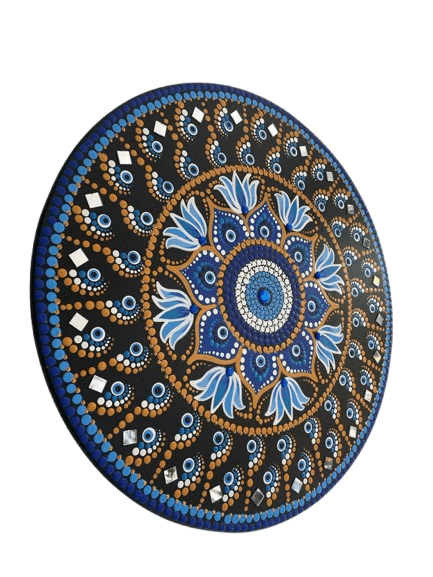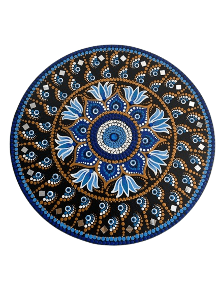 Essa mandala além de uma linda obra de arte pintada à mão, tem como finalidade harmonizar o ambiente e as pessoas que nele convivem ou frequentam com vibração e frequência de Proteção e sorte, possui uma linda pintura simbolizando movimentoi circular ao seu redor, pintada na técnica de pontilhismo e na sua self o Olho grego, também conhecido como “nazar”é um amuleto poderoso usado para proteger contra o mau-olhado, inveja e energias negativas. Com formato circular e geralmente azul, ele simboliza a espiritualidade, absorvendo vibrações negativas e transformando-as em boas energias. É comumente utilizado para proteção pessoal ou do lar. Olho Grego para Proteção Espiritual: Funciona como um escudo contra o “olho gordo”, inveja e infortúnios.