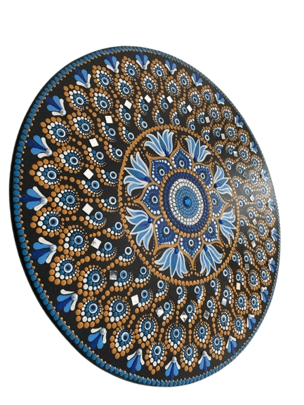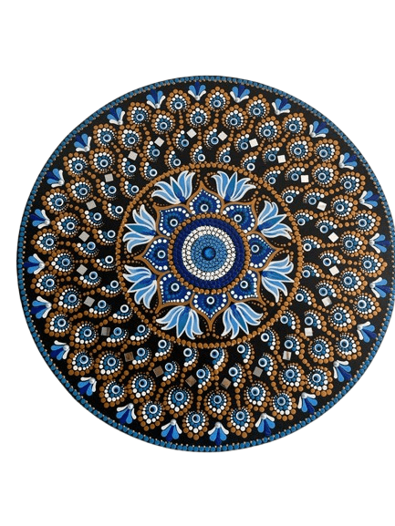 Essa mandala além de uma linda obra de arte pintada à mão, tem como finalidade harmonizar o ambiente e as pessoas que nele convivem ou frequentam com vibração e frequência de Proteção e sorte, possui uma linda pintura simbolizando movimentoi circular ao seu redor, pintada na técnica de pontilhismo e na sua self o Olho grego, também conhecido como “nazar”é um amuleto poderoso usado para proteger contra o mau-olhado, inveja e energias negativas. Com formato circular e geralmente azul, ele simboliza a espiritualidade, absorvendo vibrações negativas e transformando-as em boas energias. É comumente utilizado para proteção pessoal ou do lar. Olho Grego para Proteção Espiritual: Funciona como um escudo contra o “olho gordo”, inveja e infortúnios.