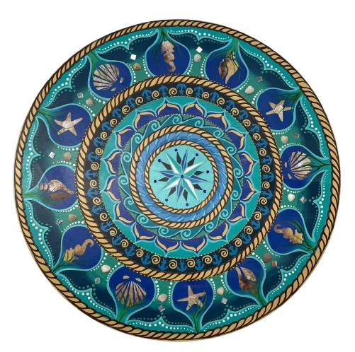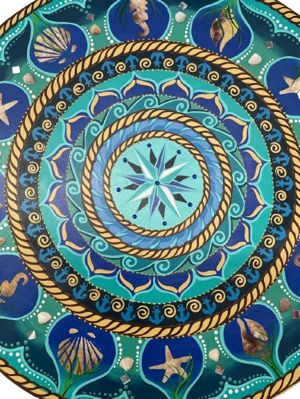 Essa mandala além de uma linda obra de arte pintada à mão, tem como finalidade harmonizar o ambiente e as pessoas que nele convivem ou frequentam, com vibração e frequência de Limpeza Energética e Proteção, criada na energia de Iemanjá tudo nela remete ao mar, temos lindas conchas, estrela do mar, cavalo marinho, corda de marinheiro e o no centro a estrela Pyxis que fica dentro da bússola, símbolizando que nosso caminho seja guiado por Iemanjá, assim com ela conduz as ondas do mar, em toda sua volta conchinhas de verdade. Iemanjá simboliza a energia geradora, força da natureza, a fecundidade e o amparo materno, pois é a Mãe da Vida. Iemanjá, além de ser a protetora dos pescadores e jangadeiros, rege as casas e os lares das pessoas, dando o sentido de união a uma família e gerando o sentimento de amor e afeto por um ente querido. Chakras: Muladhara o 1º chakra, Anahata o 4º chakra, Visudha o 5º Chakra, Ajna o 6º chakra e Sahasrara o 7º chakra.