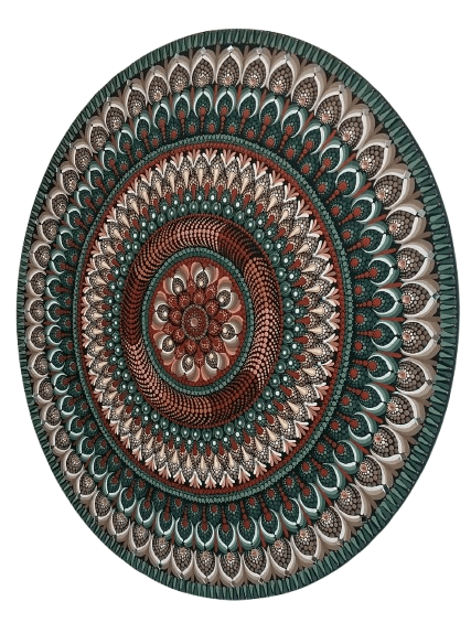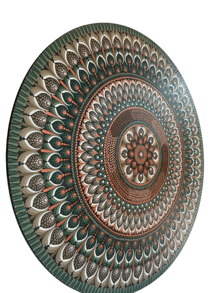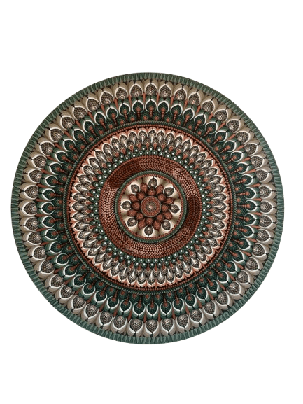 Essa mandala além de uma linda obra de arte pintada à mão na técnica de pontilhismo, tem como finalidade harmonizar o ambiente e as pessoas que nele convivem ou frequentam, com vibração e frequência de fortuna, prosperidade, cura e aceitação, utiliza na cromoterapia as cores bronze, é considerado muito bom para aumentar a capacidade de se expressar e aceitar sentimentos verdadeiros e equilibrar as qualidades pessoais e a auto afirmação, por ser um metal com preciosidade também remete a prosperidade, a cor verde para cura (física e espiritual), na self uma geometria de movimento circular de enregia. Chakras: Muladhara, o 1º chakra e Anahata, o 4º chakra