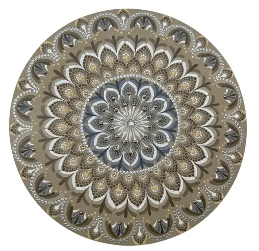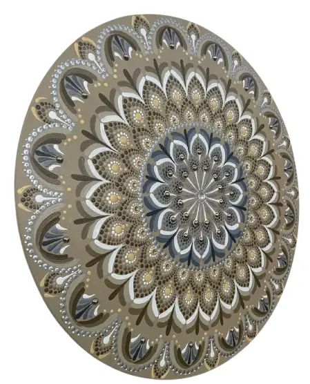 Essa mandala além de uma linda obra de arte pintada à mão, tem como finalidade harmonizar o ambiente e as pessoas que nele convivem ou frequentam, com vibração e frequência de Suavidade, Equilibrio e Tranquilidade, utiliza na cromoterapia tonalidades de bege, cinza e branco. O bege remete ao clássico, ao calmo e passivo, transmite sensatez, conforto, organização, estabilidade, confiança, simplicidade, tranquilidade e leveza. O cinza é considerado uma cor neutra que simboliza equilíbrio, estabilidade e maturidade. Ele pode ajudar a criar ambientes calmos e relaxantes, especialmente quando combinado com outras cores suaves. O branco proporciona calma e tranquilidade, cor ligada à espiritualidade e à pureza, também transmite paz.