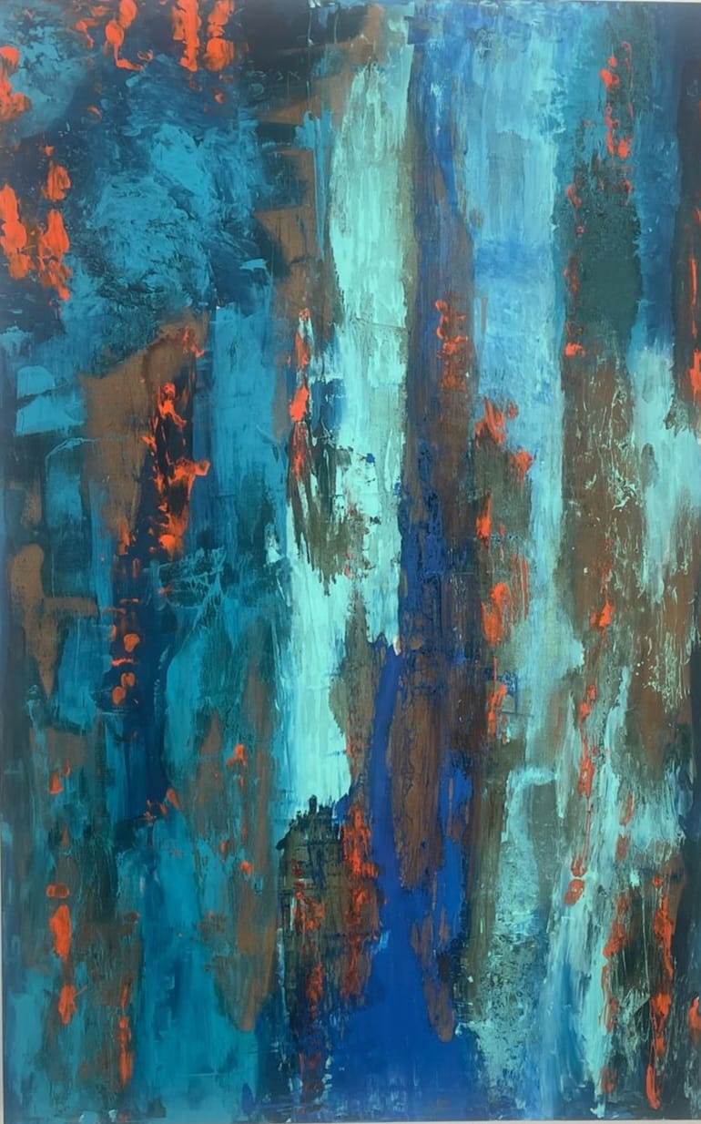 Uma obra de arte transmite ideias, sentimentos, crenças ou emoções, nesse painel expressei a combinação de sentimentos de calma e alegria, enquanto o azul transmite sensações de frescor, saúde e serenidade, o laranja traz alegria e vibração, em leves toques e em pequena proporção para trazer um pouco de alegria sem tirar a leveza dessa arte. As cores azul e laranja podem compor ambientes que já tenham tons neutros ou terrosos como base, seja nos sofás e tapetes, como nas paredes, e até mesmo combinar com outras cores. Ambientes com tons alaranjados tendem a ser mais acolhedores. A pintura continua nas beiradas do painel, dessa forma pode ser utilizado sem a necessidade de moldura, que inclusive está sendo uma tendência.